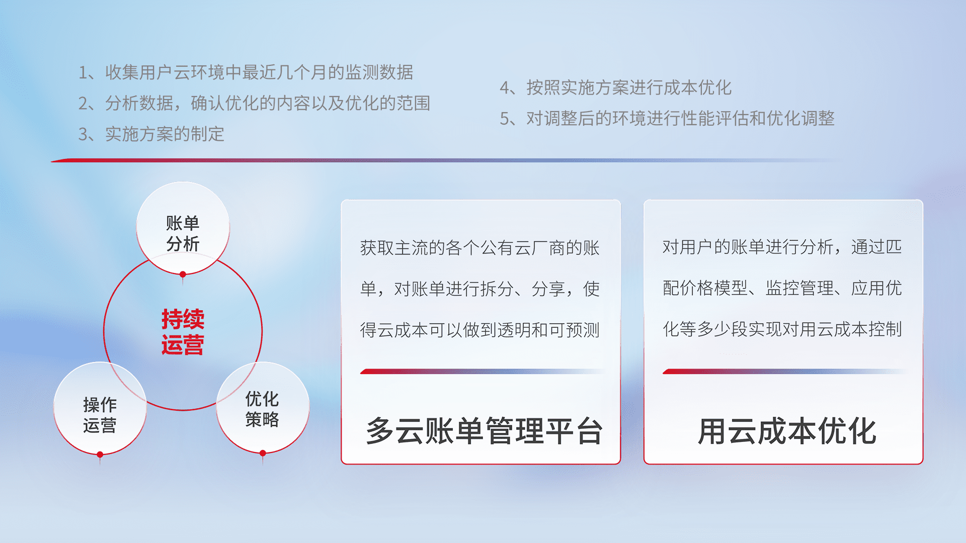通过灵活运用多种自动化迁移工具,,,,帮助企业用户实现业务和数据高效 、、、稳定的上云迁移和云上迁移,,,采用自研多云纳管平台,,,以中立管理模式,,,解决多组织、、、、多云、、多运维厂商的复杂关系的管理,,,,保证多云平台资源配置的一致性,,,,实时掌控云资源运行数据,,,运用智能化工具分析云资源多云平台的管理服务,,,,透明化管理成本支出,,用云成本可预测、、、、用云费用可优化、、、云资源配额有据可依。。。。